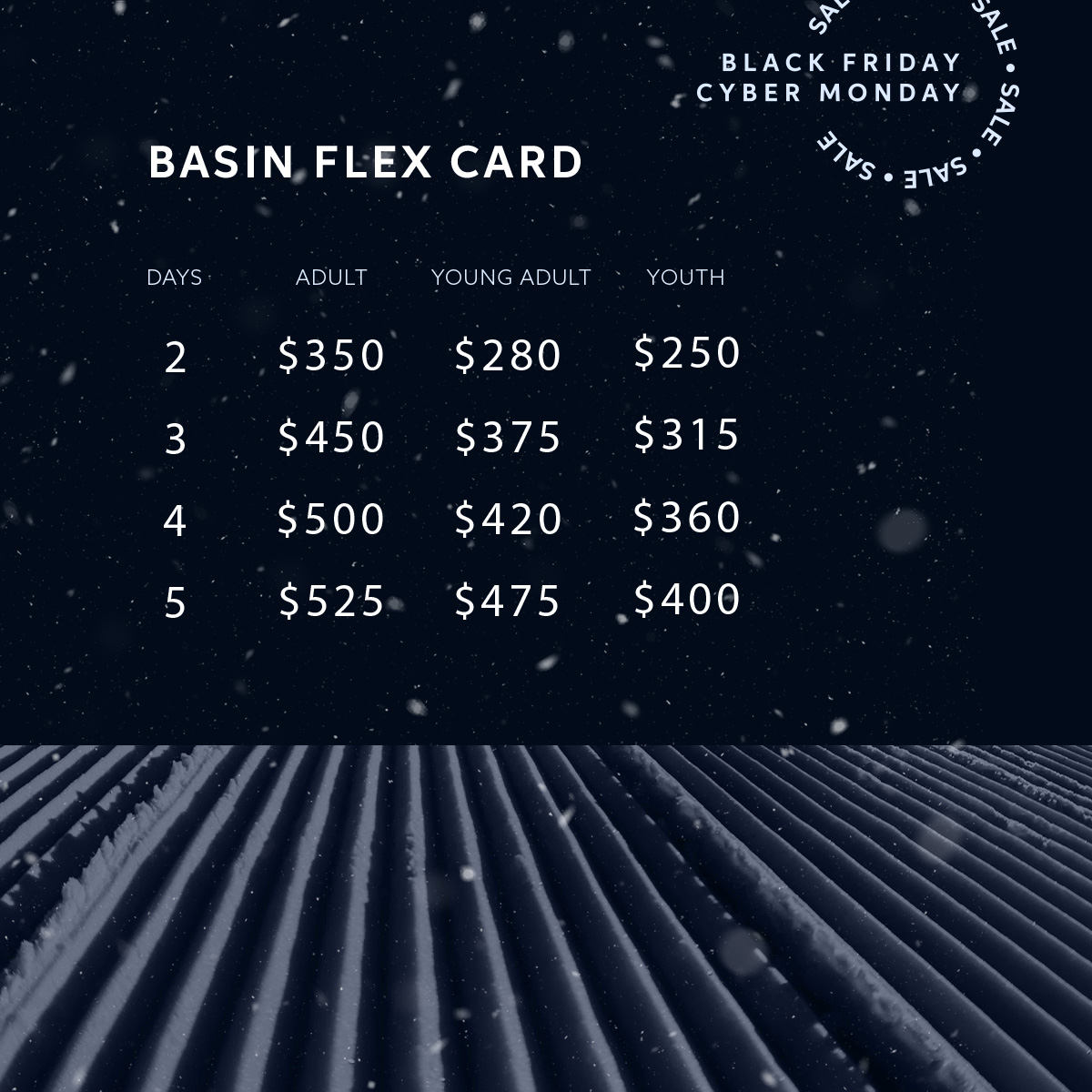 Save up to 50% on full-day tickets with the Basin Flex Card, up to $460 on season passes, and more this Black Friday!
